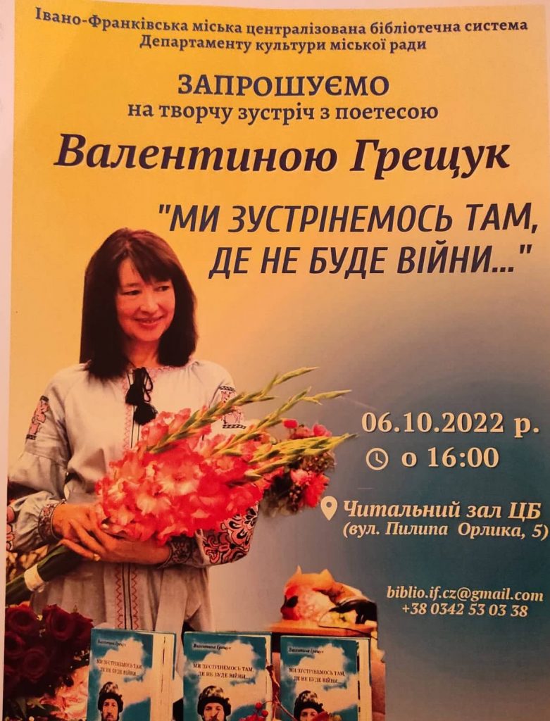 6 жовтня 2022 року у стінах читальної зали Івано-Франківської міської централізованої бібліотечної системи відбулася поетична зустріч директорки нашого Навчально-наукового інституту українознавства Валентини Ґрещук із читачами та прихильниками її творчості. Валентина Василівна разом із незмінними модераторками, Оксаною Бойко та Христиною Коцюбкою, Читати далі