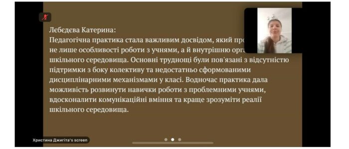 Студенти, у свою чергу, відзвітували про проведену роботу, доповнивши свої доповіді яскравими враженнями від навчального процесу, поділилися креативними підходами та інтерактивними методами, які використовували на заняттях української мови та літератури, а також розповіли про свій досвід подолання труднощів, які виникали під час практики.