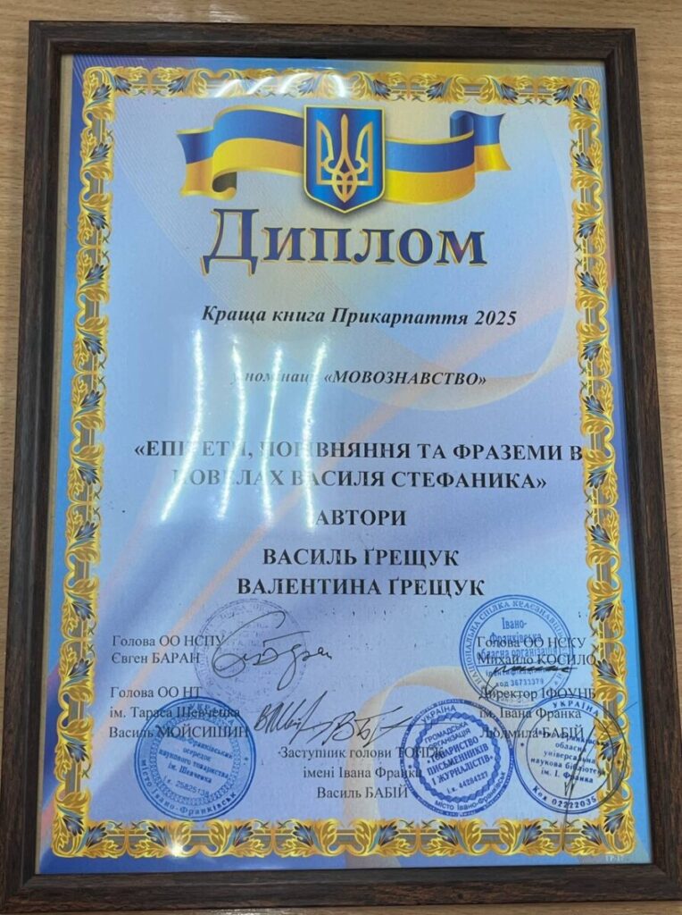 17 лютого 2026 року в Івано-Франківській обласній універсальній науковій бібліотеці імені Івана Франка відбулося урочисте нагородження лавреатів конкурсів “Найкраща книга Прикарпаття 2025” та “Краща краєзнавча книжка 2025”. Особливою подією стало відзначення директорки навчально-наукового центру українознавства, кандидатки філологічних наук, доцентки кафедри української мови Карпатського національного університету імені Василя Стефаника Валентини Ґрещук, яка була нагороджена Дипломом конкурсу “Краща книга Прикарпаття 2025″ у номінації “МОВОЗНАВСТВО” за монографію “Епітети, порівняння та фраземи в новелах Василя Стефаника” (автори: Василь Ґрещук, Валентина Ґрещук). Над цією працею Валентина Василівна невтомно працювала разом зі своїм чоловіком, професором Василем Ґрещуком, який, на жаль, недавно відійшов у вічність. Видання стало останньою прижиттєвою монографією науковця і водночас світлою пам’яткою про його наукову діяльність.