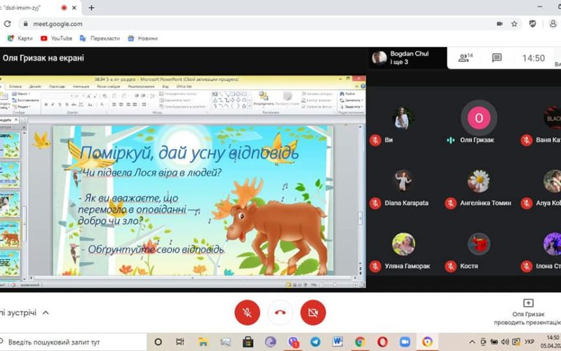 Olga Hryzak conducted a lesson on Ukrainian literature on the topic “E. Gutsalo “Moose”. Eternal confrontation of good and evil “in 5-B class, where the trainee and students plunged into the world of wildlife, where sometimes there is cruelty and indifference on the part of man. Students actively expressed their views, called to protect nature and its inhabitants, which is very important in our time.