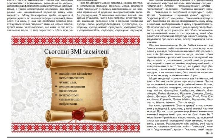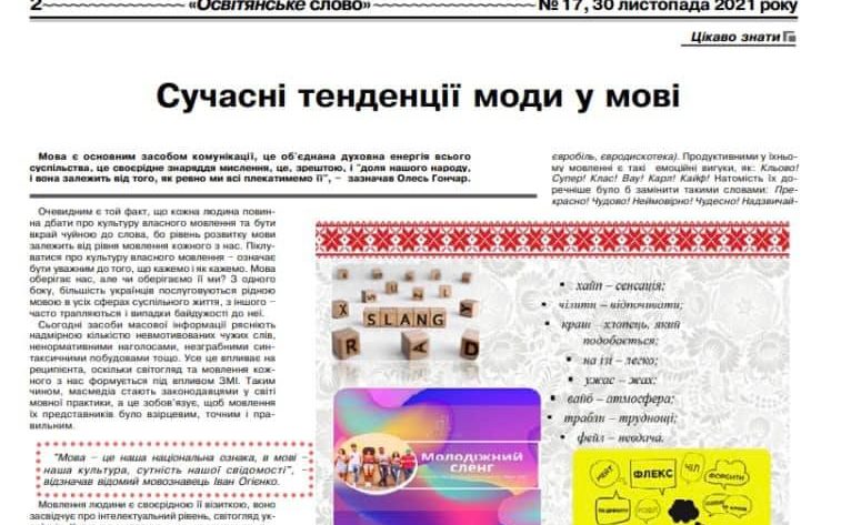 Oksana Blyskun gained another good experience by publishing her research in the newspaper “Educational word”. In the article “Modern fashion trends in language” the bachelor outlined the main fashion phenomena in language, in particular: inappropriate use of complex words with the first part of the super-, euro-; the use of slang, slang expressions, foreign words, which, of course, do not adorn our language. The idea of fashion in language originated in classes on “Stylistics and Culture of Language” (teacher: Candidate of Philological Sciences, Assoc. Prof. Valentyna Greshchuk). We hope that there will be more than one scientific work on the way of future philology.