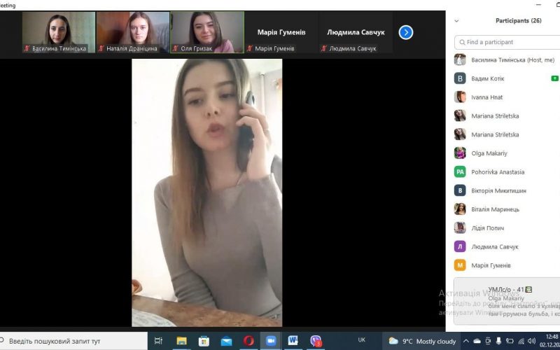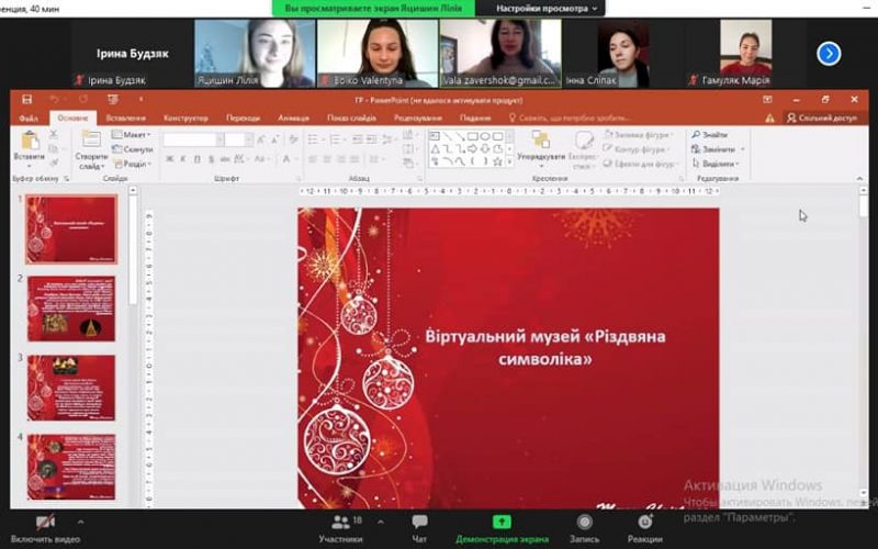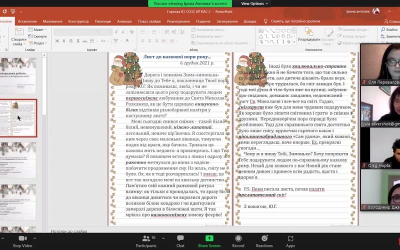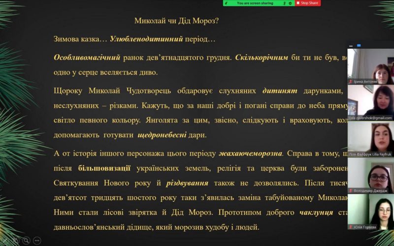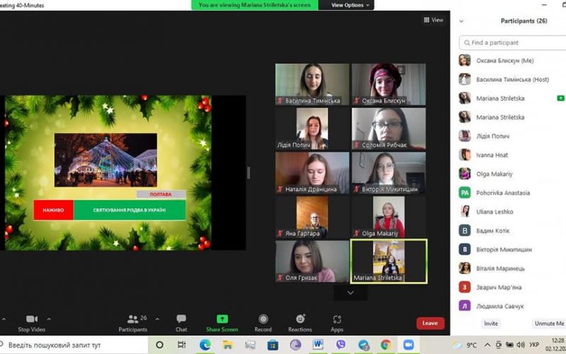 Sitting in front of computers, laptops, students visited a fairy tale and felt the pre-Christmas atmosphere in the news studio on the channel “Interesting Stylistics” and visited the cities of Ukraine for the Christmas holidays, witnessed interesting conversations and more. You could go to the picturesque Carpathian Mountains, where Hutsuls sang songs loudly, and visit the virtual museum “Christmas Symbols”, which tells about the unique symbols of Christmas in Ukraine. The audience had a great time watching the video, and the students who presented it had the opportunity to enjoy the result of their creative work.