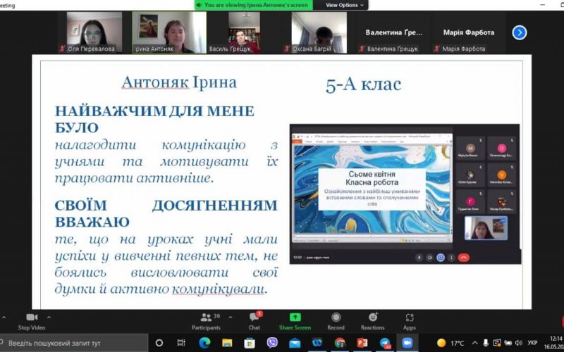 On May 16, the final meetings of the production educational and educational pedagogical practice of students of the III year of full-time and part-time education majors 0.35 Philology (Ukrainian language and literature) and 0.14 Secondary education (Ukrainian language and literature) took place, which became a kind of report on the work done. The interns talked about how they acquired new skills and the ability to find an individual approach to students, shared their successes and impressions from the internship, showed bright presentations and photos. Everyone was adept at using various programs to enhance distance learning.